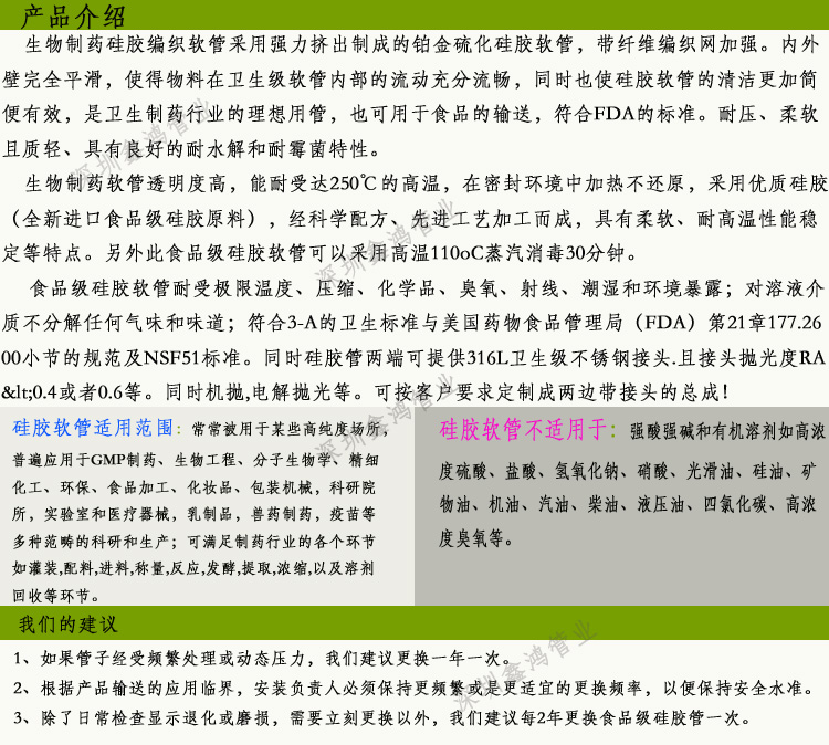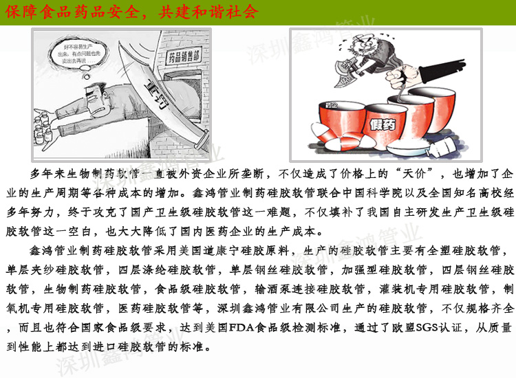 鑫鴻管業制藥矽膠軟管采用(yòng)美國(guó)道康甯矽膠原料,生産(chǎn)的矽膠軟管主要有(yǒu)矽膠鋼絲軟管,單層編織矽膠軟管,四層矽膠編織軟管,單層鋼絲矽膠軟管,醫(yī)用(yòng)矽膠軟管等,生物(wù)制藥矽膠軟管生産(chǎn)的矽膠軟管,不僅規格齊全,而且也符合國(guó)家食品級要求,達到美國(guó)FDA食品級檢測标準,通過了歐盟SGS認證,從質(zhì)量到性能(néng)上都達到進口矽膠軟管的标準。