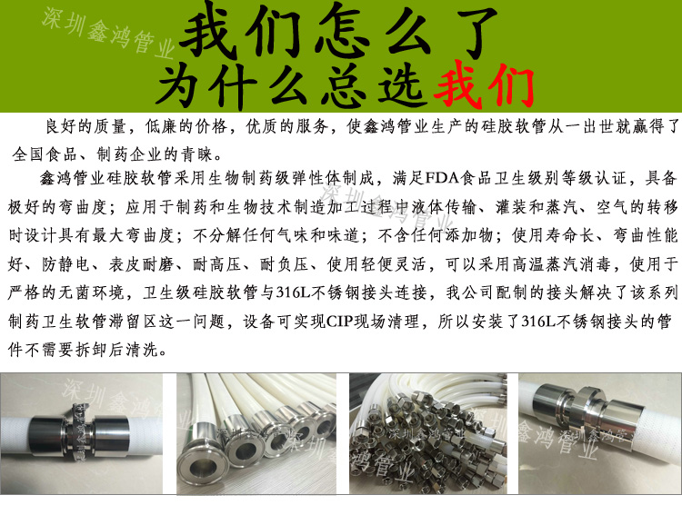 很(hěn)多(duō)客戶遇到這樣的煩惱,食品級軟管購(gòu)買之後不能(néng)直接使用(yòng),需要再采購(gòu)配件配套扣壓,或者找不到合适的配件配套,繁瑣的過程給客戶帶來不必要的困擾,鑫鴻管業針對不同的食品衛生矽膠管産(chǎn)品,結合自身豐富的産(chǎn)品經驗為(wèi)客戶提供各類接頭等加工(gōng)配套服務(wù),完成産(chǎn)品一體(tǐ)化,真正滿足客戶的需求。